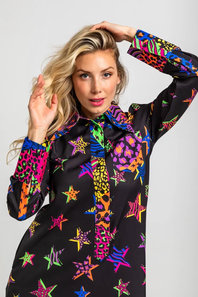 Vestido mini botones escote pico de estampado de estrellas con animal print – Shiny Girl Lolina