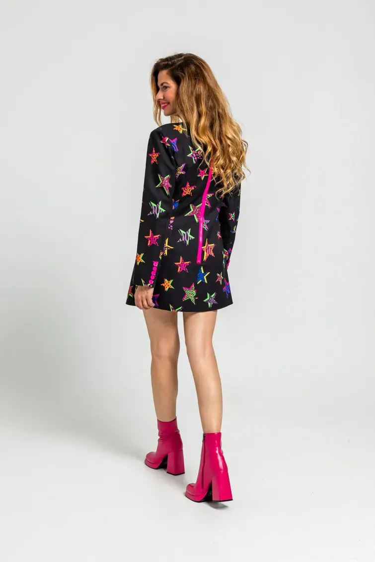 El Vestido mini botones escote pico de estampado de estrellas con animal print - Shiny Girl Lolina  funciona como un total look, solo hace falta que te pongas un calzado a juego, y ya estás lista.